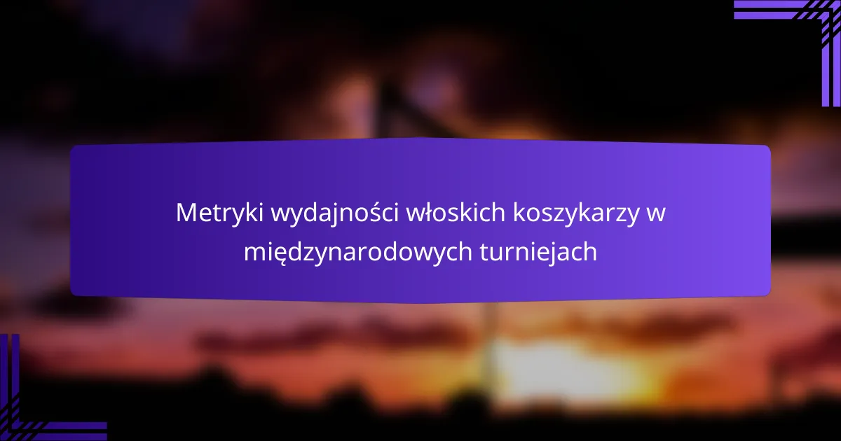 Metryki wydajności włoskich koszykarzy w międzynarodowych turniejach są kluczowe dla oceny ich skuteczności i konkurencyjności na światowej scenie. Kluczowe wskaźniki, takie jak średnie punktów, statystyki zbiórek i wskaźniki asyst do strat, ujawniają mocne i słabe strony poszczególnych graczy oraz drużyny jako całości. Te metryki kształtowane są przez czynniki takie jak doświadczenie graczy i strategie trenerskie, oferując kompleksowy obraz ich wkładu w warunkach dużej presji.